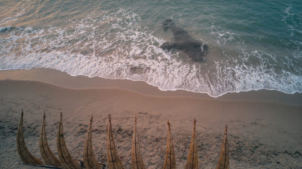 As the camera exits the reeds, the view opens to clearly reveal the row of traditional Peruvian totora boats standing on the sand beside the ocean.
