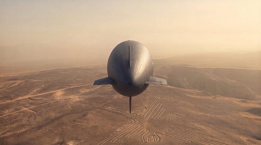 Below the airship the Nazca hummingbird geoglyph is clearly visible on the desert floor, with its long straight lines and precise geometric shapes carved into the earth.