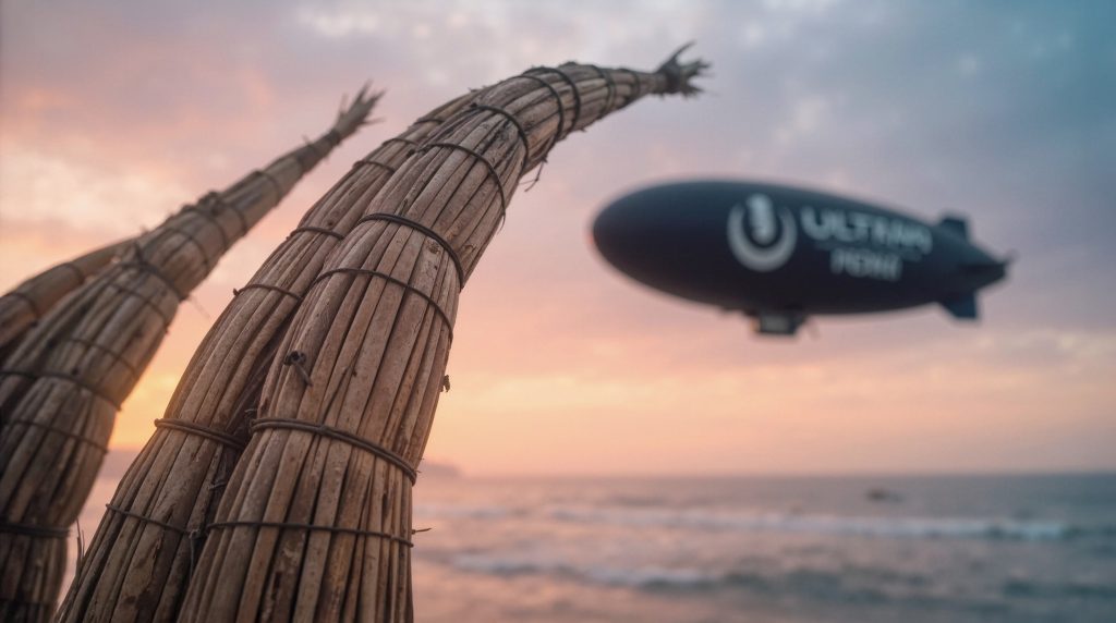 Above the ocean horizon a large dark advertising blimp with the "Ultra Peru" logo floats in the sky.