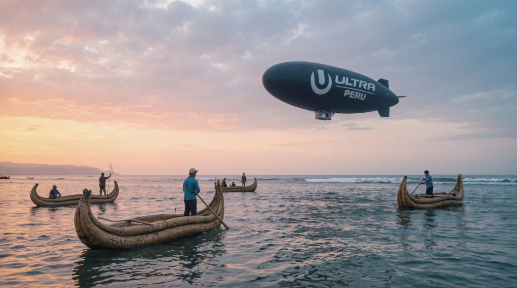 In the background sky, a large dark advertising blimp with the "Ultra Peru" logo floats slowly above the coastline.